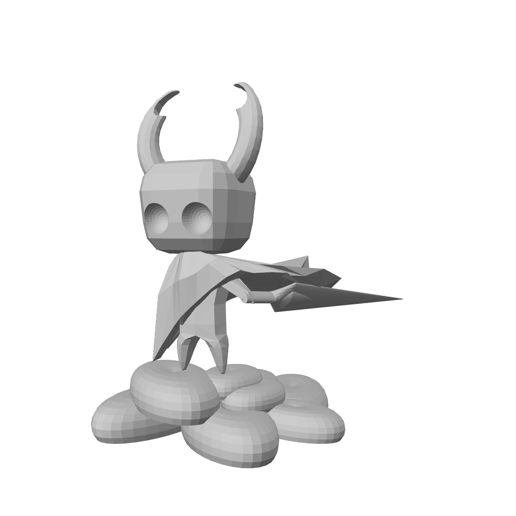 This stylized low-poly knight stands on a puffy cloud base while launching forward with a sharpened polygonal blade. The faceted geometry gives a modern collectible look while still preserving the iconic chibi proportions and mask silhouette that fans recognize.