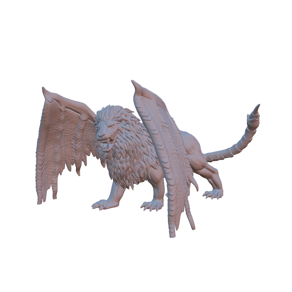 A fantasy Manticore featuring a lion’s body with dragon-style wings and sculpted musculature. Designed as a static display figure for collectibles, tabletop scenery, miniature painting, fantasy décor, or shelf display. Prints as a single-piece statue with no assembly required.